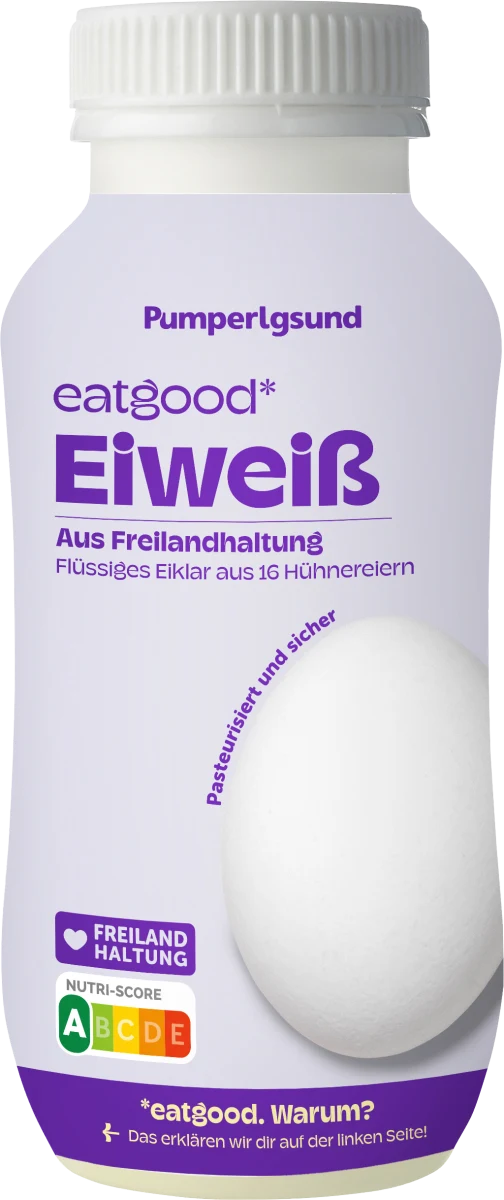 Für die 16 Freiland-Eiweiß von pumperlgsund werden Eier verwendet, die wegen ihrer Größe oder kleineren Schönheitsfehler nicht als ganzes Ei in den Supermarkt gelagen. Damit retten Sie also aktiv Eier. Das Eigelb bekommen die Konditoreien und Lebensmittelhersteller, die es zum Backen oder als Zutat benötigen.